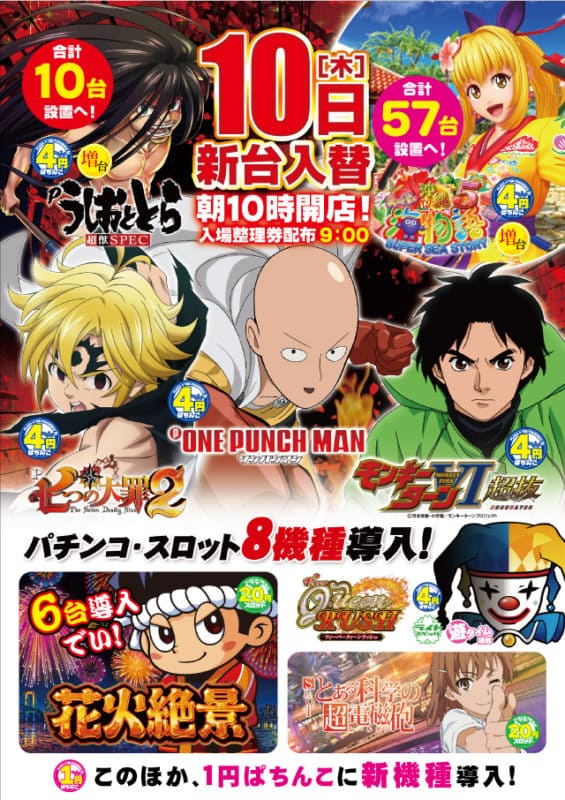 周年日のため、 分岐営業にも期待したい。まずは公約の 3台並びで設定5or6を3箇所以上 を狙って行こう。